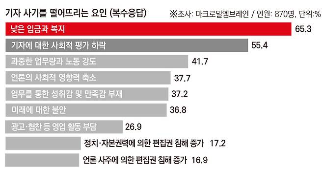 기자들 사기가 1~2년 사이 저하됐다는 응답은 지난해(90.7%)보단 낮게 나왔다. 다만 올해 조사에서도 사기가 저하됐다는 응답은 87%를 기록했고, 이 중 ‘매우 저하됐다’가 40.1%를 차지했다. 상승했다는 응답은 1.9%에 불과했다. 기자들은 사기가 저하된 이유(복수응답)로 지난해에 이어 ‘낮은 임금과 복지(65.3%)’를 가장 많이 꼽았다. ‘기자에 대한 사회적 평가 하락(55.4%)’, ‘과중한 업무량과 노동 강도(41.7%)’, ‘언론의 사회적 영향력 축소(37.7%)’, ‘업무를 통한 성취감 및 만족감 부재(37.2%)’ 등의 답변도 골고루 선택됐다.