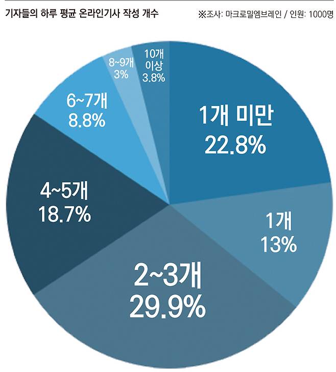 온라인 기사의 품질 문제는 언론사의 기사 생산 시스템과도 밀접한 관련이 있었다. 하루 평균 몇 건의 온라인 기사를 쓰는지 묻는 질문에 응답자의 64.2%가 2개 이상이라고 답했다. 2~3개 29.9%, 4~5개 18.7%, 6~7개 8.8%, 8~9개 3%의 비율이었다. 10개 이상이라고 답한 기자도 38명이나 있었다. 언론사 구분별로 보면 뉴스통신사(89.2%), 인터넷언론사(76.4%)에서 하루 평균 2개 이상 쓴다고 응답한 기자들이 많았고, 부서별론 경제/산업부(79.5%), 문화/스포츠부(77.8%), 과학/IT부(76.5%)에서 많은 기사를 쓰고 있었다.