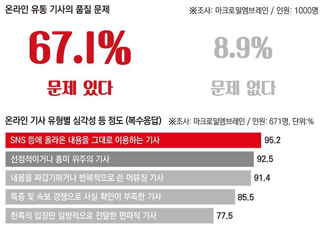 기자협회보 여론조사에 따르면 기자들의 67.1%도 온라인에 유통되는 기사의 품질에 ‘문제가 있다’고 답했다. ‘대체로 문제가 있다’에 44.5%, ‘매우 문제가 있다’에 22.6%의 비율이었다. ‘문제가 없다’는 답변은 8.9%에 그쳤다. 온라인 기사의 품질에 문제가 있다고 답한 671명의 기자들은 특히 ‘SNS 등에 올라온 내용을 팩트체킹이나 추가취재 없이 그대로 이용하는 기사’에 가장 큰 문제의식을 드러냈다. 어떤 온라인 기사가 심각한지 묻는 질문(복수응답)에 95.2%의 기자들이 SNS 내용을 이용한 기사가 문제라고 답했고 ‘선정적이거나 흥미 위주의 기사(92.5%)’, ‘내용을 짜깁기하거나 반복적으로 쓴 어뷰징 기사(91.4%)’, ‘특종 및 속보 경쟁으로 사실 확인이 부족한 기사(85.5%)’ 등도 대다수 기자들이 문제라고 응답했다.
