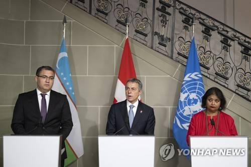 epa10124149 Ignazio Cassis (C), President of the Swiss Confederation, speaks next to Ruslanbek Davletov (L), Minister of Justice of the Republic of Uzbekistan, and Roli Asthana (R), United Nations Resident Coordinator in Uzbekistan, during a press conference, during an official visit to Switzerland at the Von Wattenwyl Haus in Bern, Switzerland, 16 August 2022. EPA/ANTHONY ANEX
