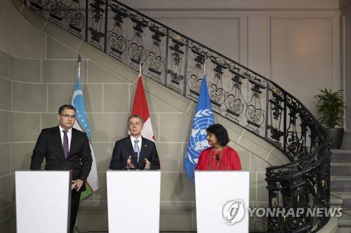 epa10124152 Ignazio Cassis (C), President of the Swiss Confederation, speaks next to Ruslanbek Davletov (L), Minister of Justice of the Republic of Uzbekistan, and Roli Asthana (R), United Nations Resident Coordinator in Uzbekistan, during a press conference, during an official visit to Switzerland at the Von Wattenwyl Haus in Bern, Switzerland, 16 August 2022. EPA/ANTHONY ANEX