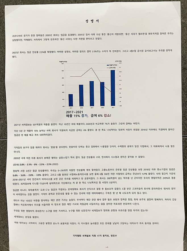 최근 세계일보 용산 신사옥 32층에 성명서 한 장이 붙었다. 2005년 세계일보에 입사한 18년차 기자 2명이 연명으로 낸 것이었다. 이들은 성명에서 정희택 사장이 취임한 2018년 대비 2021년 매출액은 8% 이상, 영업이익은 3배 이상 증가했지만, 임금인상률은 0~2%대로 묶여 있다고 주장했다. 성명에 따르면 세계일보 임금은 2018년 2.8% 인상된 이후 2019년 2.5%, 2020년 동결, 2021년 2.5% 등 거의 고정된 비율로 오르거나 제자리였다. 올해도 역시 “어떠한 설명도, 어떠한 합의도 없이 2.5%라는 수치가 툭 던져졌다”라고 이들은 밝혔다. 이들은 “2018년 이후 중소기업의 임금은 5.6%-3.6%-2.0%-3.9% 올랐다. (중략) 올해 6월 300인 미만 사업체의 급여는 전년보다 4.1% 올랐다”면서 “세계일보에 다니면 다닐수록 상대적으로 가난해지는 게 콩 한 쪽도 나눠 먹자던 정 사장의 5년”이라고 했다.