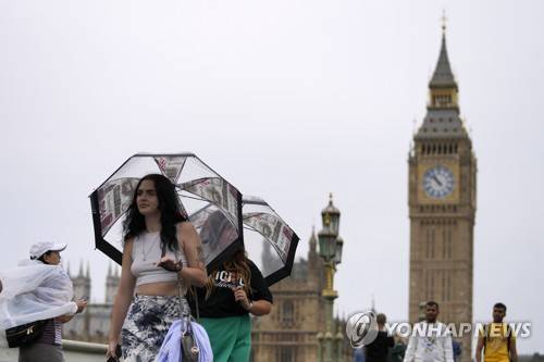 Tourists use umbrellas as light rain started in London, Tuesday, Aug. 16, 2022. The first rain has arrived in London after a long very dry period. The Met Office has issued a yellow thunderstorm warning for England and Wales on Tuesday, with conditions potentially causing more flash flooding as well as transport disruption and power cuts. (AP Photo/Frank Augstein)