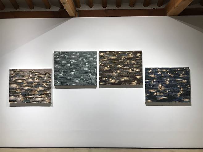 정영주 작가의 그림은 일반 회화와 달리, 한지를 구기고 찢어서 붙이는 방법으로 집의 형상을 만든 다음 아크릴 물감을 수십 차례 올려 완성하는 기법으로 그려졌다. 일단 한지에서 뿜어져 나오는 질감에서 이미 마음을 빼앗긴 나는 그림에서 눈을 떼지 못했다.