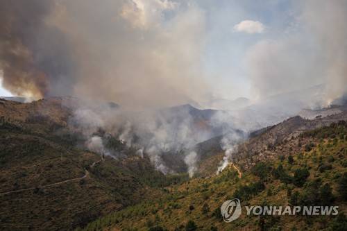 epa10124180 Smoke rise from the fire in the village of Bejis, Castellon, eastern of Spain, 16 August 2022. Some 200 firefighters try to stop the fire, that has forced a hundred people to leave their homes. EPA/Biel Alino