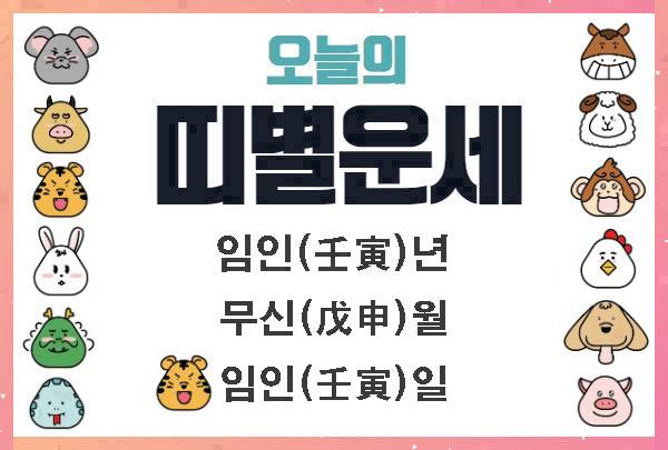 Today's fortune is published every day, at 9:00 PM the night before.2022년(단기 4355년) 8월 17일 수요일(음력 7월 20일), 손없는 날 "더사주" 띠별 운세 제공오늘은 임인(壬寅)년, 무신(戊申)월이고, 일진(日辰)은 임인(壬寅)입니다. 오늘 나의 운은 좋을까? 아니면 나쁠까? 누구나 한번쯤은 가져보는 의문이다. '더사주'의 도움으로 이러한 궁금증을 풀어본다.사주/운세/궁합 등은 단순히 '호기심이나 재미'가 아니라 '모르는 것보다는 알고 조심하고 현명하게 행동하기 위해 참고해야 할 식견'으로 인식되고 있는 만큼 하루가 시작될때 미리 체크해 두면 하루 24시간, 시간의 주인이 될 수도 있지 않을까?'오늘의 운세'를 챙겨 본다는 것은 '나를 사랑한다'는 뜻입니다. 이는 오늘의 '나'를 더 나은 내일의 '나'로 만들고자 하는 '나를 사랑하는 마음'이 있기 때문입니다.Taking care of 'Today's fortune' means 'love myself'.