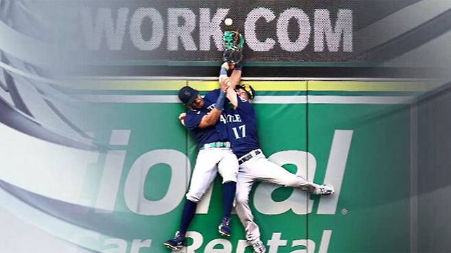시애틀 중견수와 우익수가 전력 질주해 동시에 점프했는데 서로 부딪혀 넘어지고, 공은 펜스 맞고 다시 그라운드로 들어왔는데요.