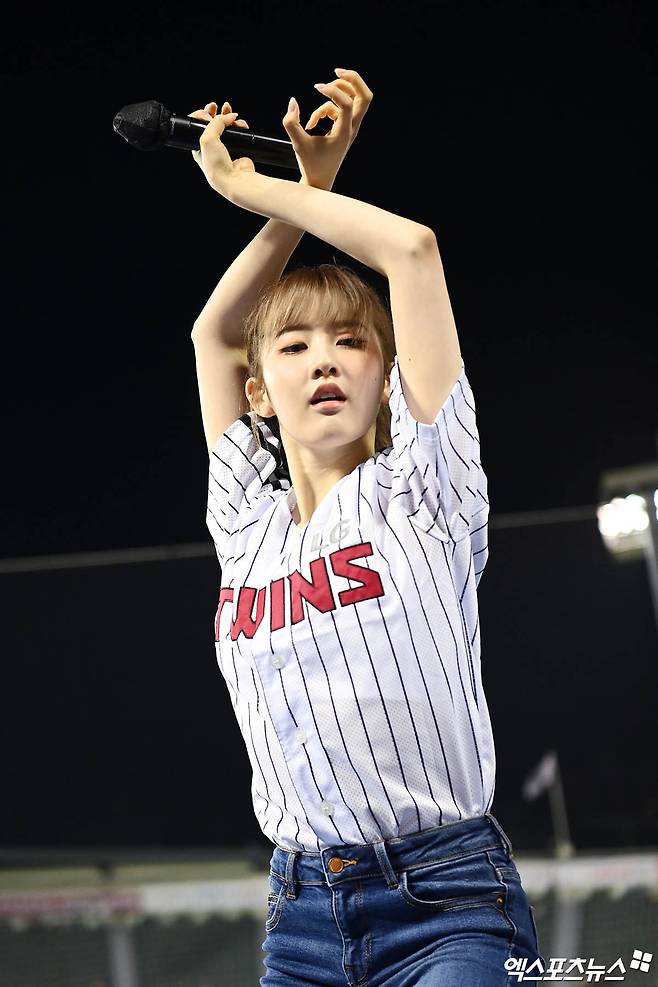 (엑스포츠뉴스 잠실, 박지영 기자) 16일 오후 서울 송파구 잠실야구장에서 열린 '2022 신한은행 SOL KBO리그' 삼성 라이온즈와 LG 트윈스의 경기, 클리닝타임 때 스테이씨 시은이 특별 공연을 선보이고 있다.