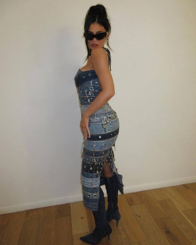 영앤리치에 몸매까지 완벽한 카일리제너의 개성 넘치는 쉴드 셰이드 선글라스 패션. 데님 벨트를 이어 붙인 듯한 아일렛 포인트 드레스에 쉴드 셰이드 선글라스를 매치했다. 그의 드레스에는 각종 실버 펜던트들까지 추가되어 저세상급 세련됨을 자랑했다.
