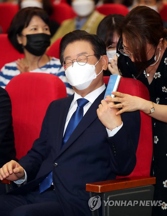 (전주=연합뉴스) 정경재 기자 = 16일 전북대에서 열린 '전북사랑 토크콘서트'에서 이재명 더불어민주당 당 대표 후보가 지지자가 들고 온 책에 사인을 한뒤 돌려주고 있다. 2022.8.16