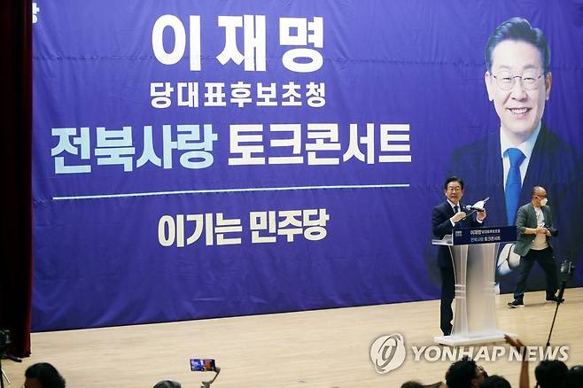 (전주=연합뉴스) 정경재 기자 = 16일 전북대에서 열린 '전북사랑 토크콘서트'에서 이재명 더불어민주당 당 대표 후보가 연단에 올라 연설을 준비하고 있다. 2022.8.16