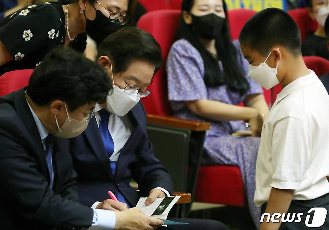 (전주=뉴스1) 유경석 기자 = 이재명 더불어민주당 당대표 후보가 16일 전북 전주시 전북대학교 학술문화관에서 열린 '전북사랑 토크콘서트'에서 한 어린이에게 싸인을 해주고 있다. 2022.8.16/뉴스1
