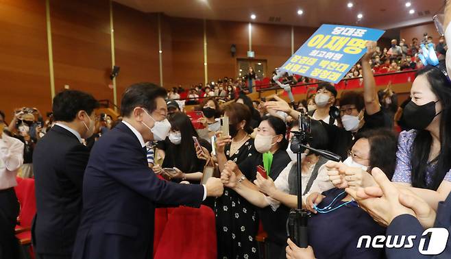 (전주=뉴스1) 유경석 기자 = 이재명 더불어민주당 당대표 후보가 16일 전북 전주시 전북대학교 학술문화관에서 열린 '전북사랑 토크콘서트'에서 지지자들과 인사를 나누고 있다. 2022.8.16/뉴스1