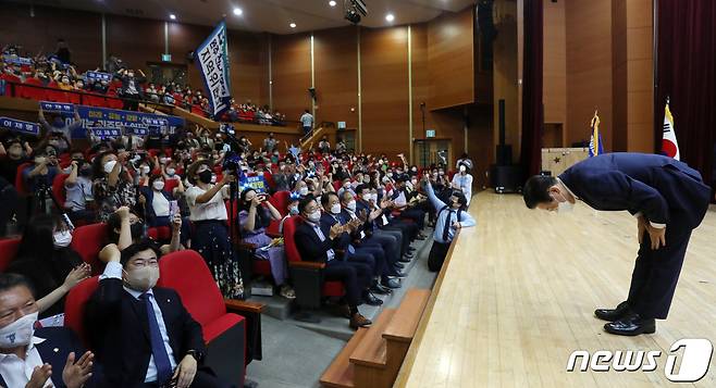 (전주=뉴스1) 유경석 기자 = 이재명 더불어민주당 당대표 후보가 16일 전북 전주시 전북대학교 학술문화관에서 열린 '전북사랑 토크콘서트'에서 지지자들에게 인사를 하고 있다. 2022.8.16/뉴스1