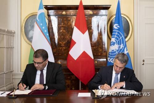 epa10124201 Ignazio Cassis (R), President of the Swiss Confederation, and Ruslanbek Davletov (L), Minister of Justice of the Republic of Uzbekistan, sign an agreement on the restitution of assets that were definitively confiscated in the criminal proceedings in connection with Gulnara Karimova, during an official visit to Switzerland at the Von Wattenwyl Haus in Bern, Switzerland, 16 August 2022. EPA/ANTHONY ANEX