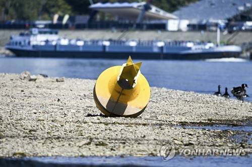A cargo ship passes a danger buoy lying on dry land in Dusseldorf, North Rhine-Westphalia, Germany. After weeks of drought, the water levels of the Rhine have reached historic lows. (Federico Gambarini/dpa via AP) GERMANY OUT; MANDATORY CREDIT