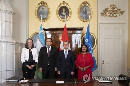 epa10124200 Ignazio Cassis (C-R), President of the Swiss Confederation, Ruslanbek Davletov (C-L), Minister of Justice of the Republic of Uzbekistan, Jennifer Topping (L), Executive Coordinator of the United Nations Multi-Partner Trust Fund Office (UN MPTF), and Roli Asthana (R), United Nations Resident Coordinator in Uzbekistan, pose after signing agreements, during an official visit to Switzerland at the Von Wattenwyl Haus in Bern, Switzerland, 16 August 2022. EPA/ANTHONY ANEX