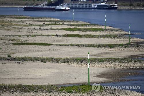 A cargo ship sails past dry land on the Rhine, in Dusseldorf, North Rhine-Westphalia, Germany. After weeks of drought, the water levels of the Rhine have reached historic lows. (Federico Gambarini/dpa via AP) GERMANY OUT; MANDATORY CREDIT