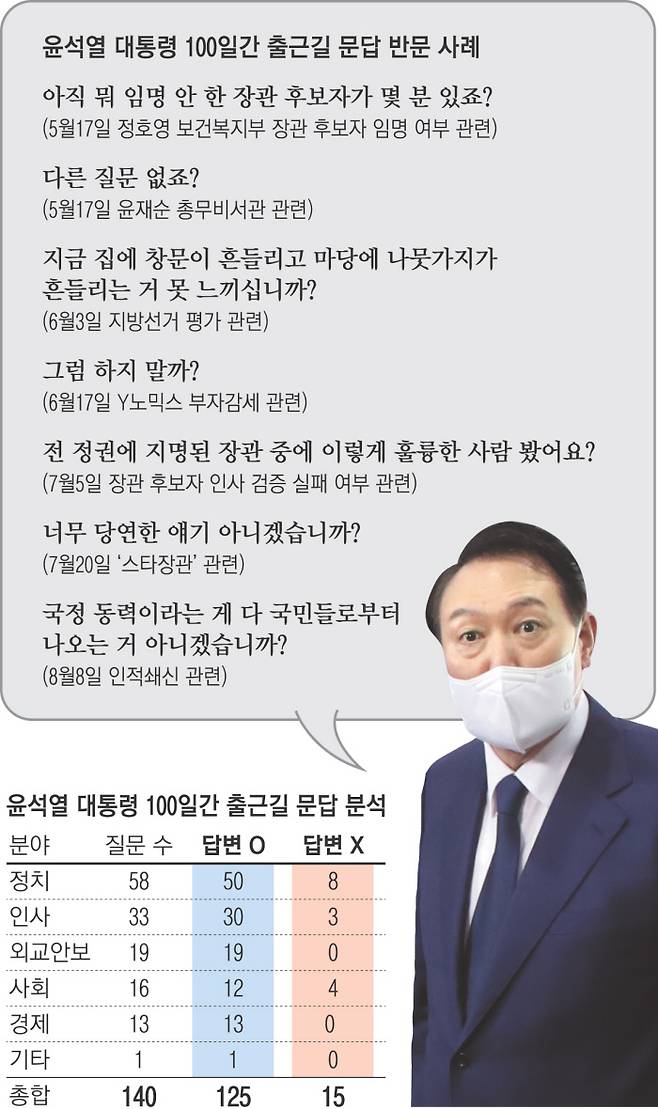 전체 140개 질문 중 윤 대통령이 답변을 하지 않은 질문은 15개였다. 이 중 10개는 출근길 문답을 마치고 떠나는 윤 대통령의 등 뒤에 던져진 질문이었고, 5개는 윤 대통령이 “다른 질문 없죠?”(5월17일 윤재순 총무비서관 논란), “더 궁금한 것이 있으면 내일 하십시다”(7월8일 국정원의 박지원 전 국정원장 고발), “거기에 대해선 더 답변 안 할게요”(7월20일 대우조선해양 파업) 등 답변을 피하거나 거부한 경우였다. 답변하지 않은 경우는 정치 분야(8건)가 가장 많았고 사회(4건), 인사(3건) 순이었다.