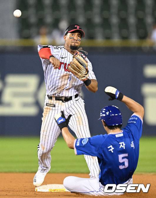 8회초 무사 만루 삼성 피렐라의 유격수 앞 땅볼 때 LG 2루수 가르시아가 1루 주자 구자욱을 포스아웃 시킨 뒤 1루로 송구하고 있다. 주자 1루 세이프, 3루 주자 오선진 홈인. 2022.08.16 /ksl0919@osen.co.kr