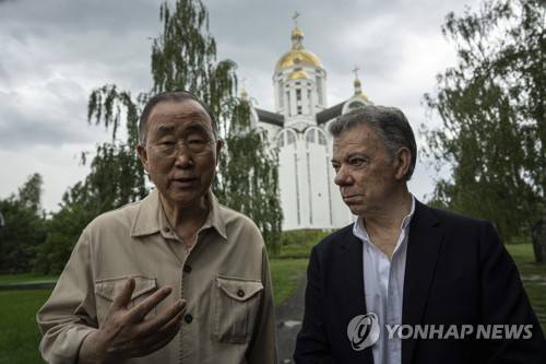 Former U.N. Secretary-General Ban Ki-moon, left, and former Colombia's President Juan Manuel Santos speak to the Associated Press during their visit in Bucha near Kyiv, Ukraine, Tuesday, Aug. 16, 2022. The former leader of the United Nations called on the world Tuesday to honour civilian victims killed during the Russian attack on Kyiv. (AP Photo/Evgeniy Maloletka)