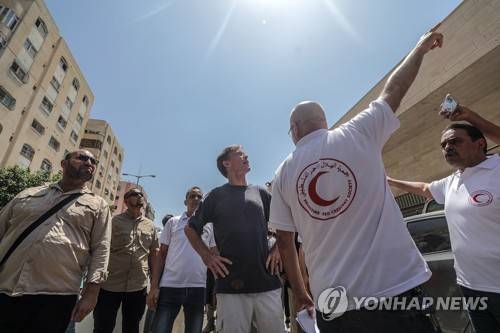 epa10124219 Sven Kuehn von Burgsdorff (C), head of the European Union's mission to the West Bank and Gaza Strip, during his visit to Gaza City, 16 August 2022. Burgsdorff visited Al Shifa hospital, Al Shati United Nation school and the Palestinian Red Crescent in Gaza. EPA/MOHAMMED SABER
