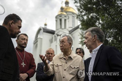 Former U.N. Secretary-General Ban Ki-moon, centre, and former Colombia's President Juan Manuel Santos, right, speaks to father Andrii during their visit in Bucha near Kyiv, Ukraine, Tuesday, Aug. 16, 2022. The former leader of the United Nations called on the world Tuesday to honour civilian victims killed during the Russian attack on Kyiv. (AP Photo/Evgeniy Maloletka)