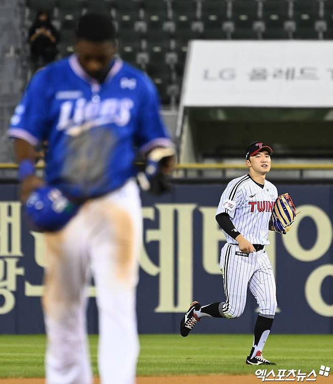 (엑스포츠뉴스 잠실, 박지영 기자) 16일 오후 서울 송파구 잠실야구장에서 열린 '2022 신한은행 SOL KBO리그' 삼성 라이온즈와 LG 트윈스의 경기, 8회초 2사 1,3루 LG 박해민이 삼성 김성윤의 플라이 타구를 처리한 뒤 더그아웃으로 향하고 있다.