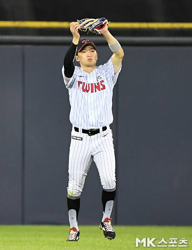 8회초 2사 1,3루에서 LG 박해민이 삼성 김성윤의 타구를 수비하고 있다.