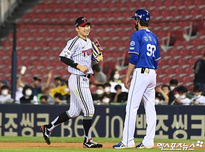 (엑스포츠뉴스 잠실, 박지영 기자) 16일 오후 서울 송파구 잠실야구장에서 열린 '2022 신한은행 SOL KBO리그' 삼성 라이온즈와 LG 트윈스의 경기, 8회초 2사 1,3루 LG 박해민이 삼성 김성윤의 플라이 타구를 처리한 뒤 더그아웃으로 향하며 삼성 강명구 주루코치와 이야기를 나누고 있다.