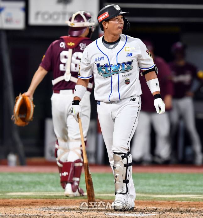 KT 박경수가 16일 수원KT 위즈파크에서 열린 2022프로야구 KT위즈와 키움히어로즈의 경기 8회말 2사 2루에서 삼진으로 물러나고 있다. .2022.8.16.
