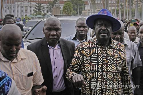 Kenyan presidential candidate Raila Odinga, right, arrives prior to delivering an address to the nation at his campaign headquarters in downtown Nairobi, Kenya, Tuesday, Aug. 16, 2022. Kenya is calm a day after Deputy President William Ruto was declared the winner of the narrow presidential election over longtime opposition figure Raila Odinga. (AP Photo/Ben Curtis)