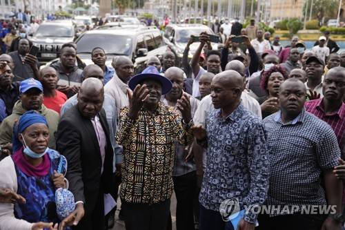 Kenyan presidential candidate Raila Odinga, center, speaks with the crowd prior to delivering an address to the nation at his campaign headquarters in downtown Nairobi, Kenya, Tuesday, Aug. 16, 2022. Kenya is calm a day after Deputy President William Ruto was declared the winner of the narrow presidential election over longtime opposition figure Raila Odinga. (AP Photo/Ben Curtis)