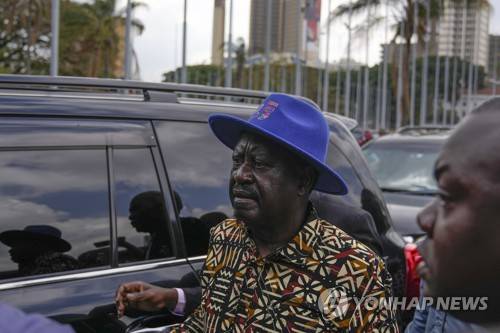 Kenyan presidential candidate Raila Odinga, center, arrives prior to delivering an address to the nation at his campaign headquarters in downtown Nairobi, Kenya, Tuesday, Aug. 16, 2022. Kenya is calm a day after Deputy President William Ruto was declared the winner of the narrow presidential election over longtime opposition figure Raila Odinga. (AP Photo/Ben Curtis)