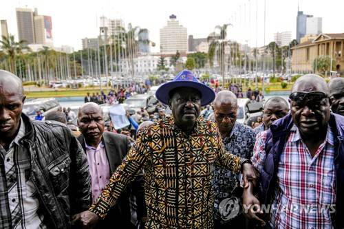 Kenyan presidential candidate Raila Odinga, center, arrives prior to delivering an address to the nation at his campaign headquarters in downtown Nairobi, Kenya, Tuesday, Aug. 16, 2022. Kenya is calm a day after Deputy President William Ruto was declared the winner of the narrow presidential election over longtime opposition figure Raila Odinga. (AP Photo/Ben Curtis)
