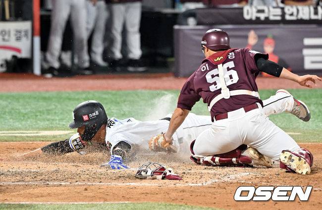 9회말 1사 주자 1,3루 KT 배정대가 좌익수 희생플라이때 장성우가 홈으로 몸을 날려 세이프되고 있다. 2022.08.16 /rumi@osen.co.kr