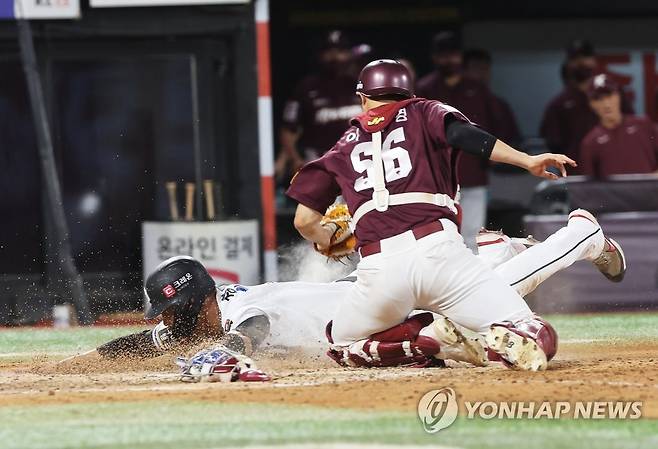 (수원=연합뉴스) 홍기원 기자 = 16일 경기도 수원케이티위즈파크에서 열린 2022 KBO리그 프로야구 키움 히어로즈와 kt wiz의 경기. 9회말 1사 주자 1,3루에서 KT 배정대의 희생플라이 때 3루 주자 장성우가 홈에서 세이프되며 끝내기 득점을 하고 있다. 2022.8.16