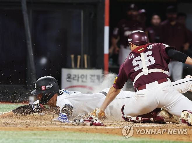 (수원=연합뉴스) 홍기원 기자 = 16일 경기도 수원케이티위즈파크에서 열린 2022 KBO리그 프로야구 키움 히어로즈와 kt wiz의 경기. 9회말 1사 주자 1,3루에서 KT 배정대의 희생플라이 때 3루 주자 장성우가 홈에서 세이프되며 끝내기 득점을 하고 있다. 2022.8.16