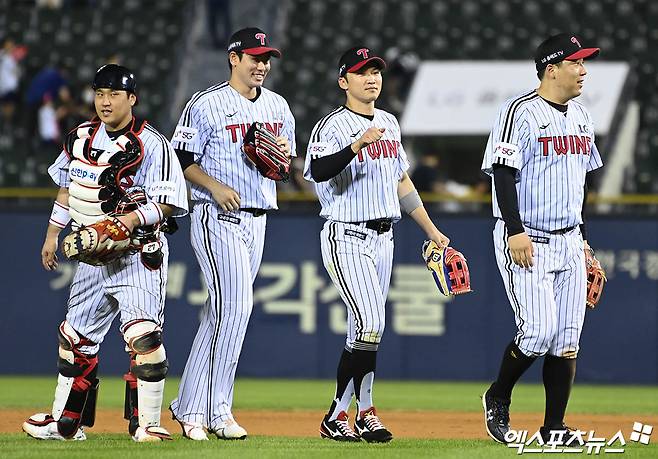 경기 종료 후 LG 유강남, 홍창기, 박해민, 김현수가 승리의 기쁨을 나누고 있다.