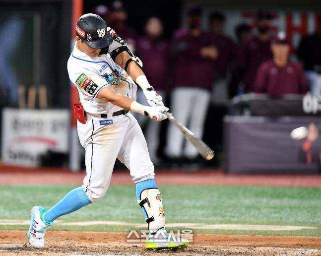 16일 수원KT 위즈파크에서 열린 2022프로야구 KT위즈와 키움히어로즈의 경기 9회말 1사 1,3루 2번 배정대가 큼지막한 외야플라이로 3루주자 장성우를 홈으로 불러들이며 경기를 끝내고 있다.2022.8.16.