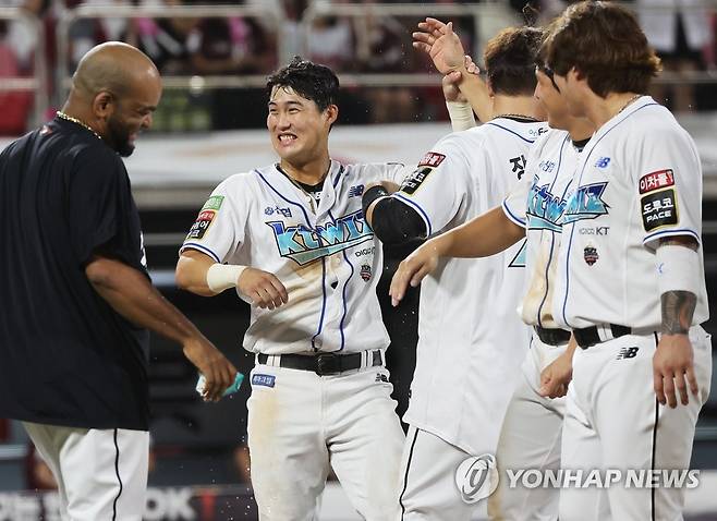 (수원=연합뉴스) 홍기원 기자 = 16일 경기도 수원케이티위즈파크에서 열린 2022 KBO리그 프로야구 키움 히어로즈와 kt wiz의 경기. 9회말 1사 주자 1,3루에서 KT 배정대가 끝내기 희생플라이를 치고 동료들의 축하를 받고 있다. 2022.8.16