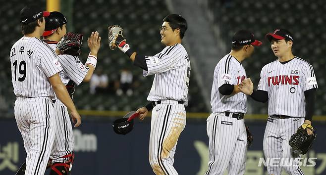 [서울=뉴시스] 조성우 기자 = 16일 오후 서울 송파구 잠실야구장에서 열린 2022 KBO리그 삼성 라이온즈와 LG 트윈스의 경기, LG 선수들이 삼성에 6-3으로 승리를 거둔 뒤 기쁨을 나누고 있다. 2022.08.16. xconfind@newsis.com