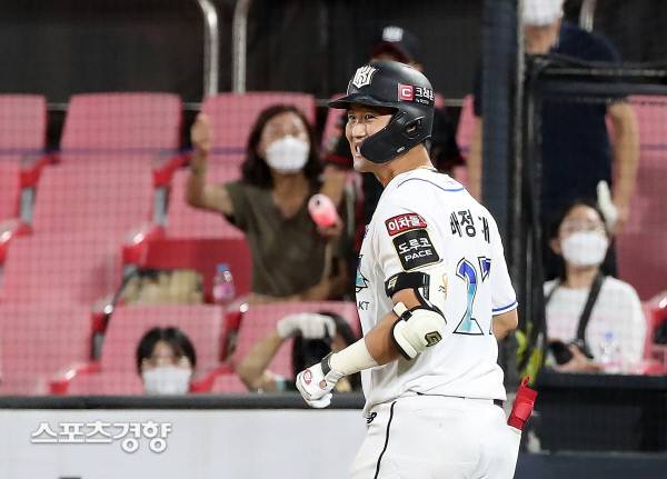 KT 배정대가 16일 수원kt위즈파크에서 열린 KBO리그 키움과 경기에서 3회말 안타 친 뒤 기뻐하고 있다. 2022.8.16