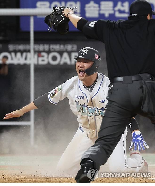 (수원=연합뉴스) 홍기원 기자 = 16일 경기도 수원케이티위즈파크에서 열린 2022 KBO리그 프로야구 키움 히어로즈와 kt wiz의 경기. 9회말 1사 주자 1,3루에서 KT 배정대의 희생플라이 때 3루 주자 장성우가 홈에서 세이프되며 끝내기 득점을 하고 있다. 2022.8.16