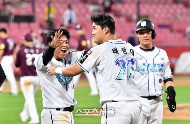 16일 수원KT 위즈파크에서 열린 2022프로야구 KT위즈와 키움히어로즈의 경기 9회말 1사 1,3루 2번 배정대가 큼지막한 외야플라이로 3루주자 장성우를 홈으로 불러들이며 경기를 끝냈다. 비디오판독이 이어지며 혼란스러웠지만 득점이 인정되며 경기는 종료됐다. 조용호의 축하받는 배정대. 2022.8.16.