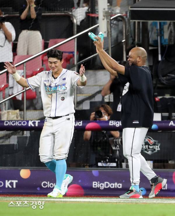 KT 배정대가 16일 수원kt위즈파크에서 열린 KBO리그 키움과 경기에서 9회말 긑내기 희생플라이를 친 뒤 데스파이네의 물세례를 받고 있다. 2022.8.16