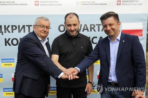 From left, Poland's Minister of Infrastructure Andrzej Adamczyk, his Ukrainian counterpart Olexandr Kubrakov and Poland's head of the Prime Minister's office Michal Dworczyk pose for a picture during an opening of the updated Krakovets - Korcheva border crossing point in Krakovets, Ukraine, Tuesday, Aug. 16, 2022. A renovation of Krakovets border crossing point is a part of the Ukraine - Poland open border project. (AP Photo/Roman Baluk)