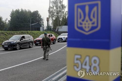 A Ukrainian border guard officer looks at a line of cars at the Krakovets - Korcheva border crossing point in Krakovets, Ukraine, Tuesday, Aug. 16, 2022. A renovation of Krakovets border crossing point is a part of the Ukraine - Poland open border project. (AP Photo/Roman Baluk)