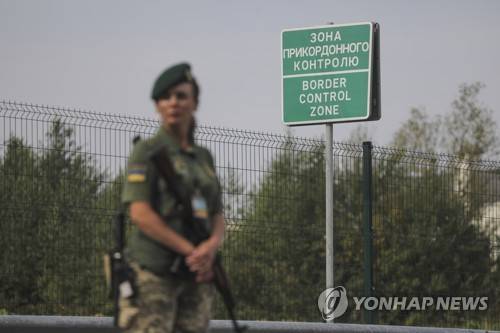 Ukrainian border guard officer stands guard at the Krakovets - Korcheva border crossing point in Krakovets, Ukraine, Tuesday, Aug. 16, 2022. A renovation of Krakovets border crossing point is a part of the Ukraine - Poland open border project. (AP Photo/Roman Baluk)
