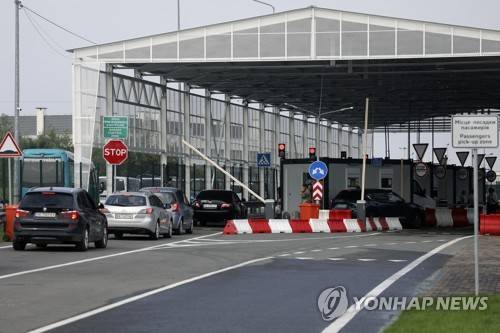 Cars wait in a line at the Krakovets - Korcheva border crossing point in Krakovets, Ukraine, Tuesday, Aug. 16, 2022. A renovation of Krakovets border crossing point is a part of the Ukraine - Poland open border project. (AP Photo/Roman Baluk)